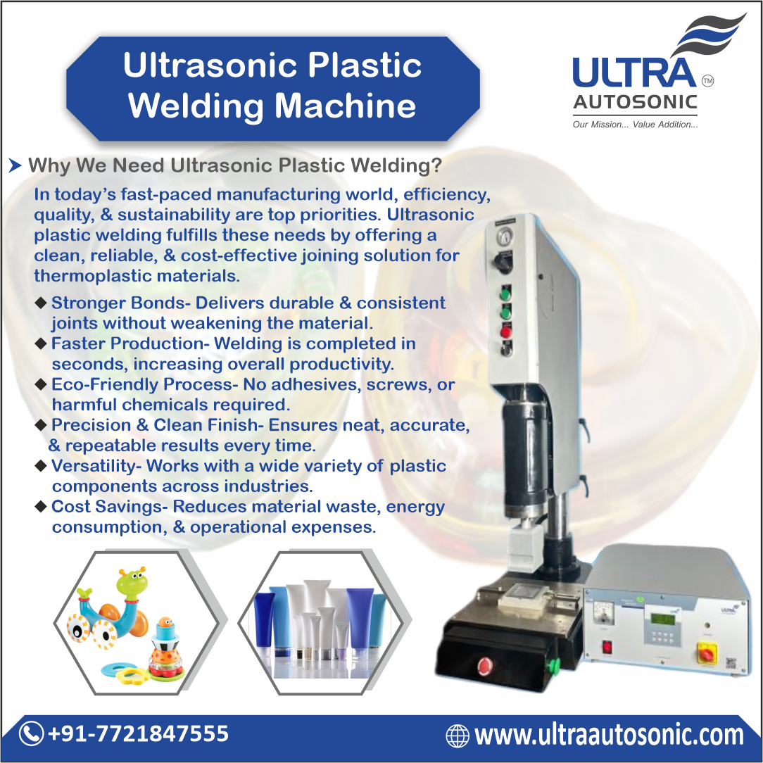 In today’s fast-growing manufacturing sector, precision, speed, and reliability are no longer optional -they are essential. From automotive and medical to packaging and electronics industries, high-quality plastic welding plays a critical role in product strength and safety. As Indian manufacturing continues to grow under initiatives like Make in India, advanced ultrasonic plastic welding machines help industries stay competitive in global markets. 📩 Contact us today to know more! +91-7721847555 / 77175 77176 www.ultraautosonic.com